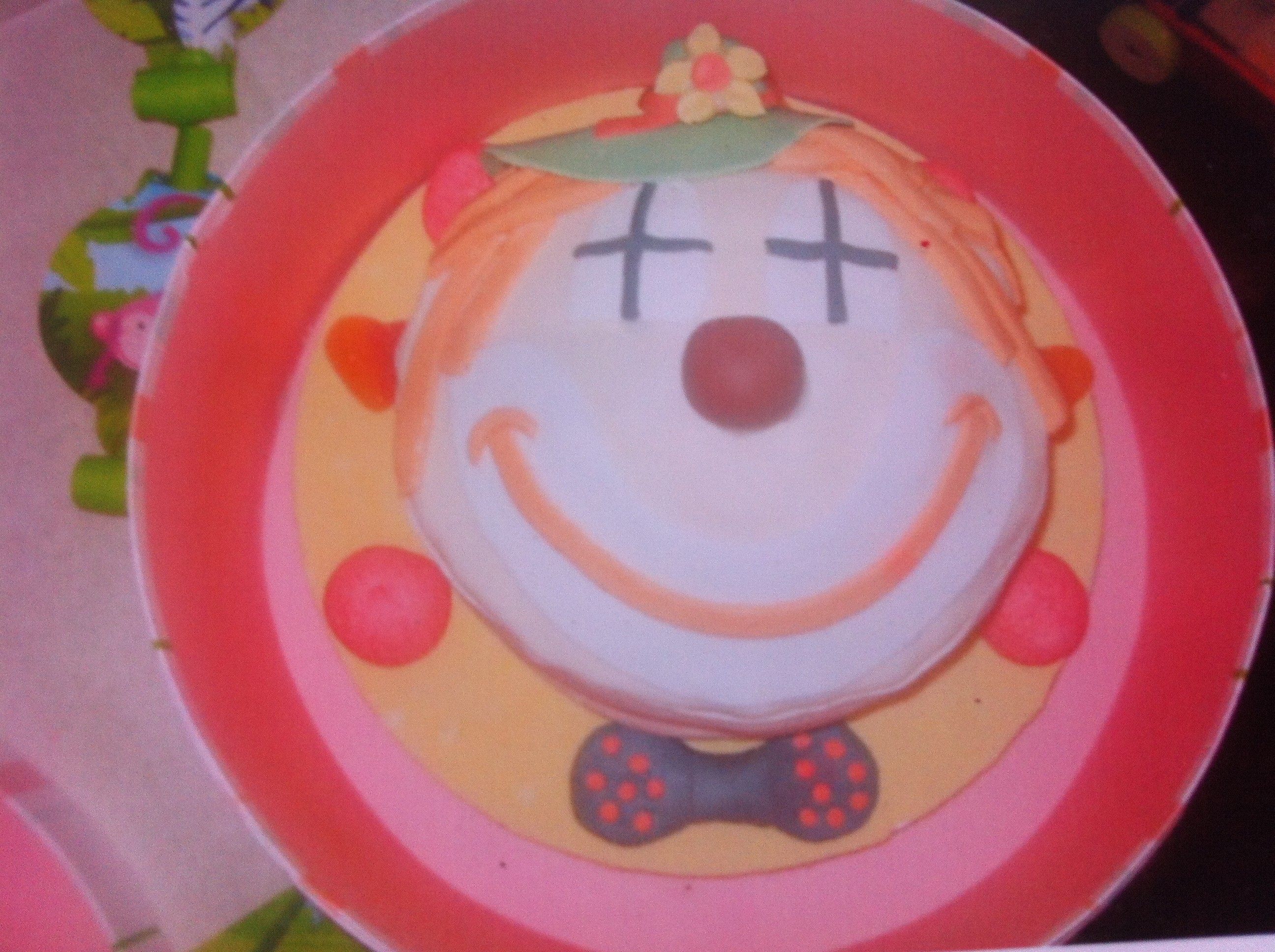 This is a clown cake I made for my Godchild Marie on her first birthday. It was a sponge with fruit (fresh strawberries) and cream filling. I decorated with coloured sugarpaste and surrounded the cake with some large sweets.