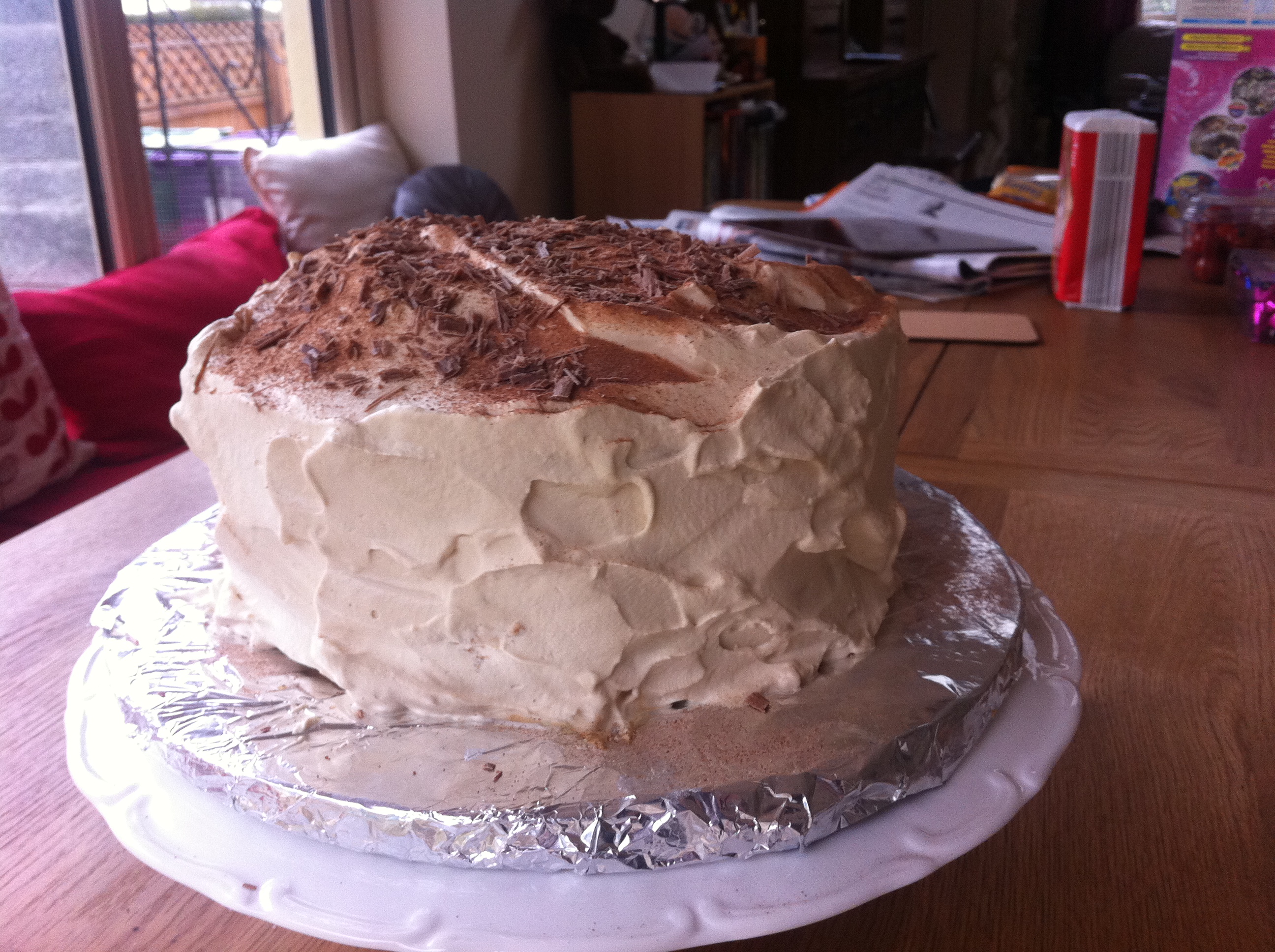 Strawberries are traditionally not used, instead the filling is simply raspberry or strawberry jam. Personally I like fresh fruit with any sponge and strawberries and cream is a combination that is hard to beat. Slice the washed strawberries so that they are flat and won’t cause the cake to become too uneven. I like some jam on this cake and I used raspberry jam, not too much – just enough to have a thin spread over the cake. Place the strawberries evenly and generously over the sponge. whip the cream and dollop it over the strawberries. Give a good generous amount of cream as the cake tastes better with a moist centre.
